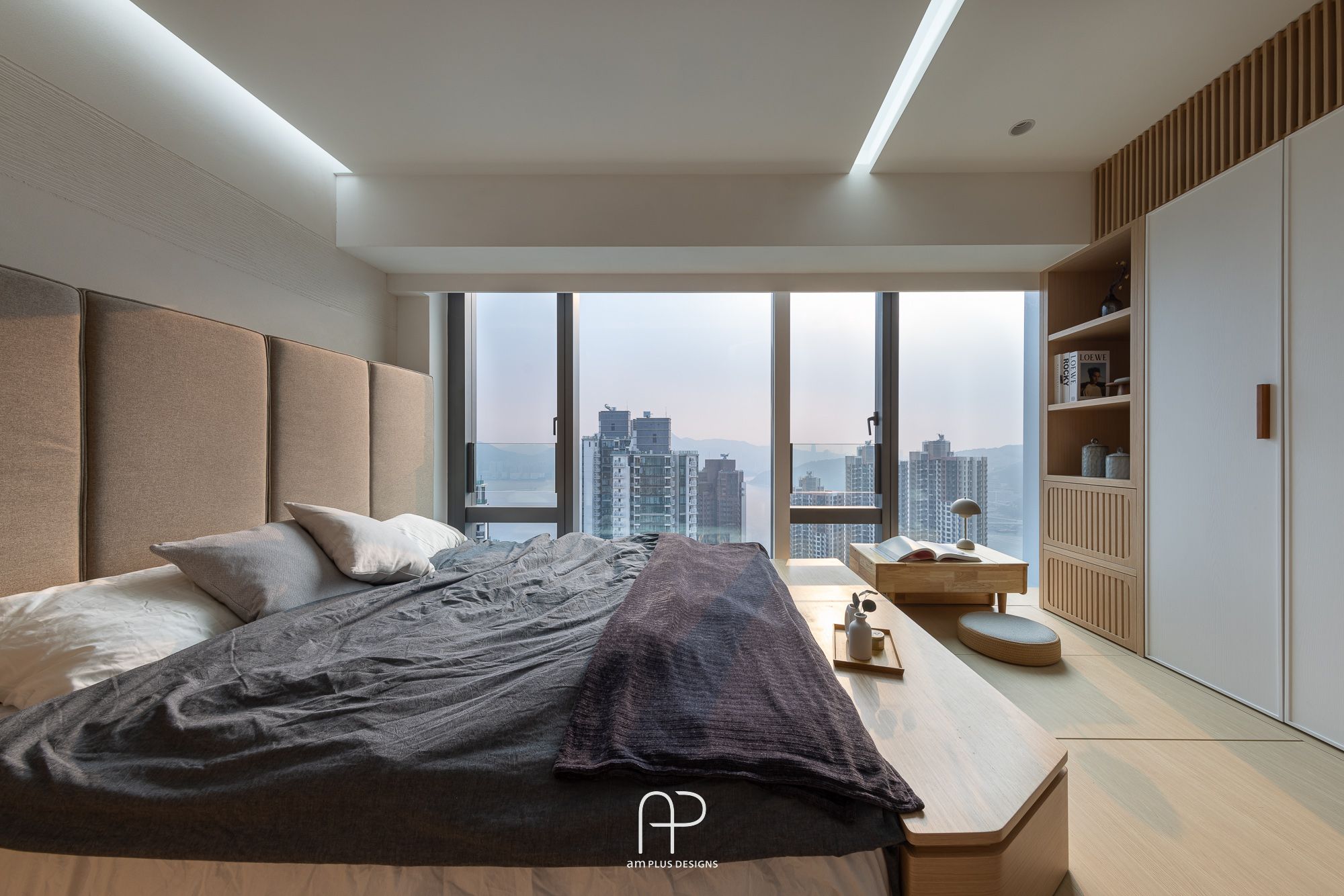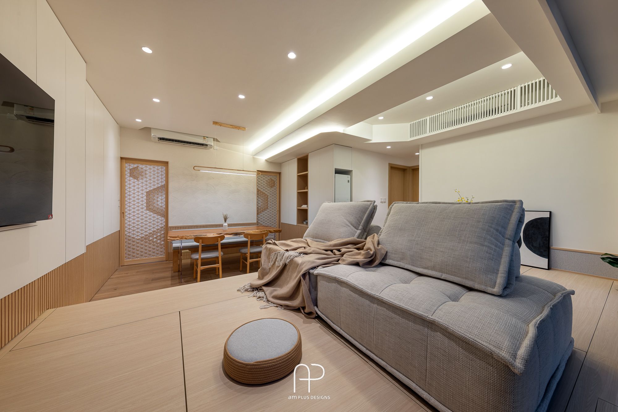 這次 am Plus 全屋空間掌握了日式設計核心,單位使用眾多傳統日式、自然、木質元素,並在造型、燈光、物料搭配上加入不同巧思,以有別以往的新式簡約日系風格,打造舒適居家空間。